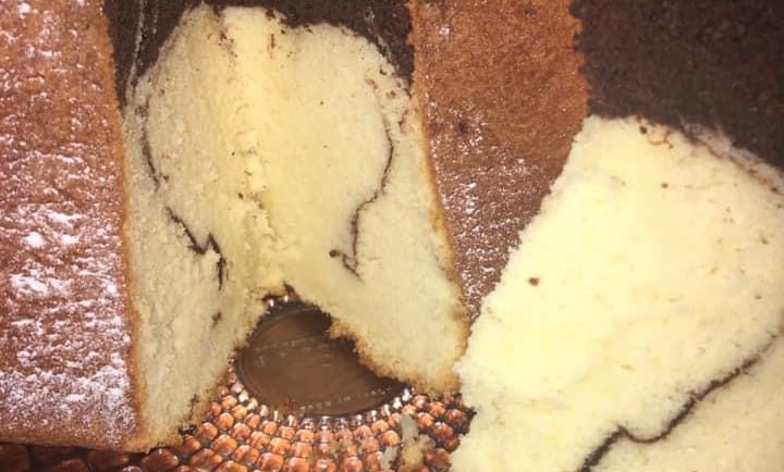 Imburrare e infarinare uno stampo per pandoro (preferibilmente da 750 g). Versare prima il composto bianco nello stampo, e successivamente aggiungere quello al cacao, per creare un effetto marmorizzato.Cuocere la chiffon cake: