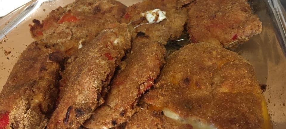 Adagiare sopra una fetta sottile di mozzarella (e, se desiderato, una fetta di prosciutto cotto), quindi coprire con un’altra falda di peperone. Immergere delicatamente la cotoletta così formata nell’uovo sbattuto, assicurandosi che sia ben ricoperta.Impanare: