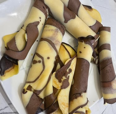 Cottura delle crêpes: Riscalda una padella antiaderente e versa un po' di pastella chiara, distribuendola uniformemente sulla superficie. Poi, aggiungi un po' di pastella al cacao sopra quella chiara, creando un effetto marmorizzato. Cuoci per circa 1-2 minuti per lato, finché le crêpes non saranno dorate. Ripeti l'operazione con la restante pastella.