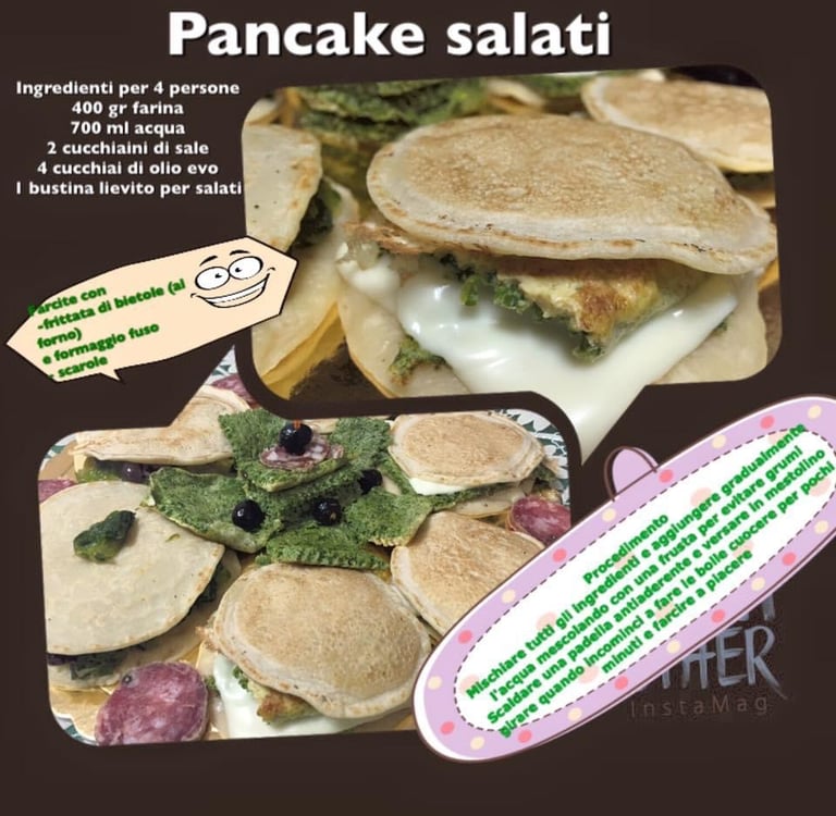 I pancake salati sono una fantastica alternativa ai classici pancake dolci e sono ideali per un pranzo veloce o una cena leggera. Questa ricetta semplice e versatile offre una base morbida e saporita, perfetta per essere farcita con una varietà di ingredienti. In questa versione, i pancake vengono serviti con una gustosa frittatina e delle scarole stufate, creando un piatto equilibrato e ricco di sapori. Preparare questi pancake salati è facile e veloce, e con la giusta farcitura possono trasformarsi in un pasto soddisfacente e delizioso.
