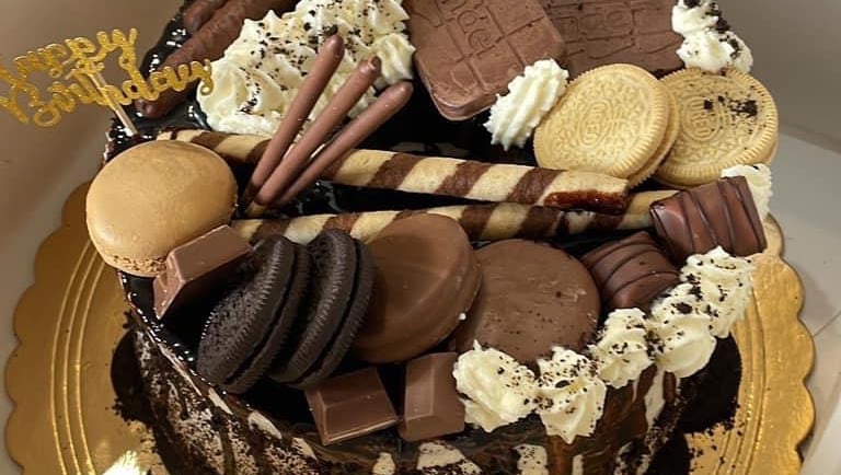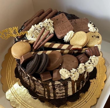 Versare la ganache di cioccolato sui bordi della torta facendola colare. Completare la decorazione con biscotti Oreo, Togo, Kinder Cards, macarons e cioccolatini vari. Riporre in frigo prima di servire.